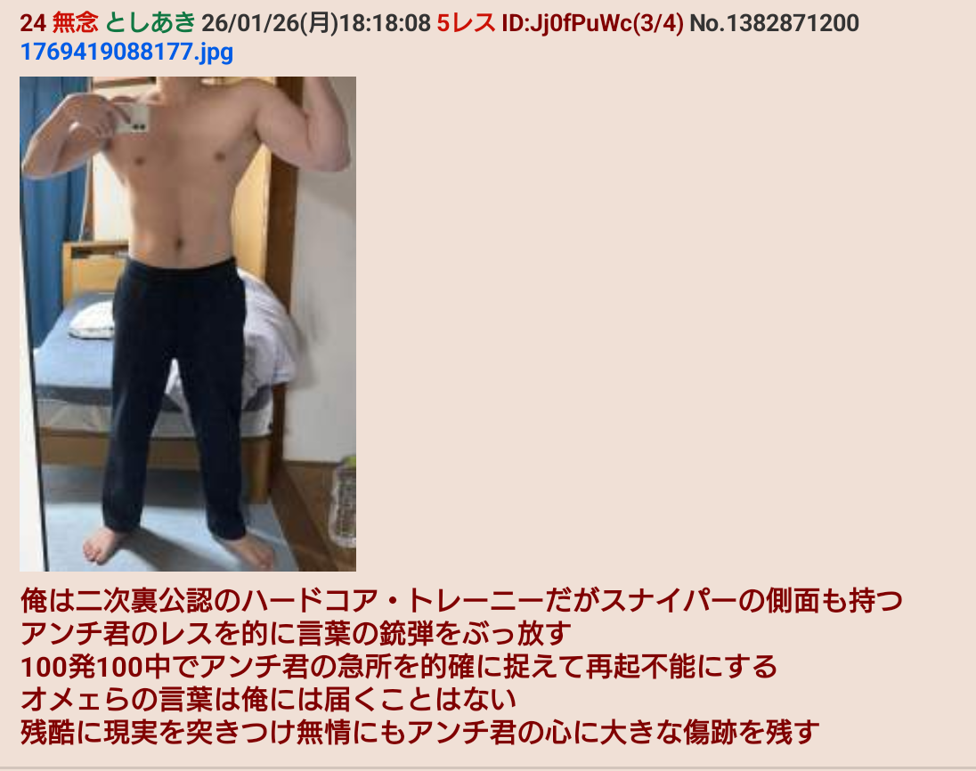 | … | 28無念Nameとしあき26/01/26(月)18:19:08No.1382871399そうだねx1>俺は二次裏公認のハードコア・トレーニーだがスナイパーの側面も持つ |