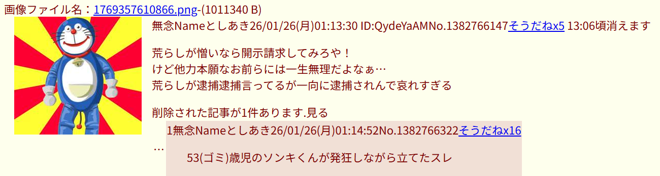 | … | 54無念Nameとしあき26/01/26(月)18:23:32No.1382872190+アンチが開示請求に震えてる? |