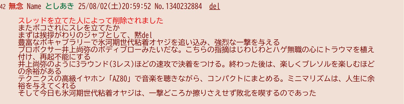 | … | 647無念Nameとしあき26/01/26(月)20:53:42No.1382908274+これさ全てのレスに友達いないの?ってつけたら全部反応できなくなるんじゃね? |