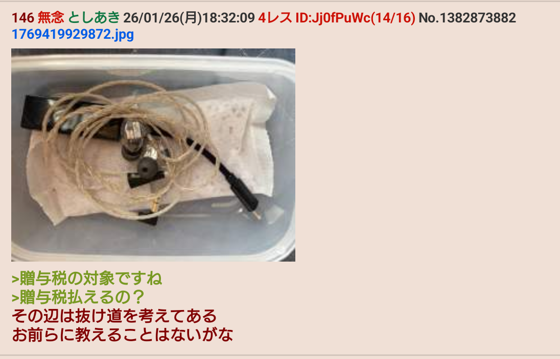 | … | 601無念Nameとしあき26/01/26(月)20:18:06No.1382898905+>これを特権だと思ってるような頭だぞ |