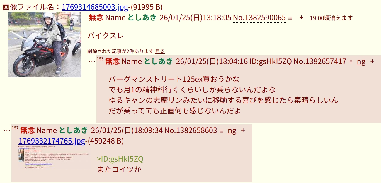 | … | 595無念Nameとしあき26/01/26(月)20:06:22No.1382895941そうだねx2>バイクスレが豚に乗っ取られたぞ |