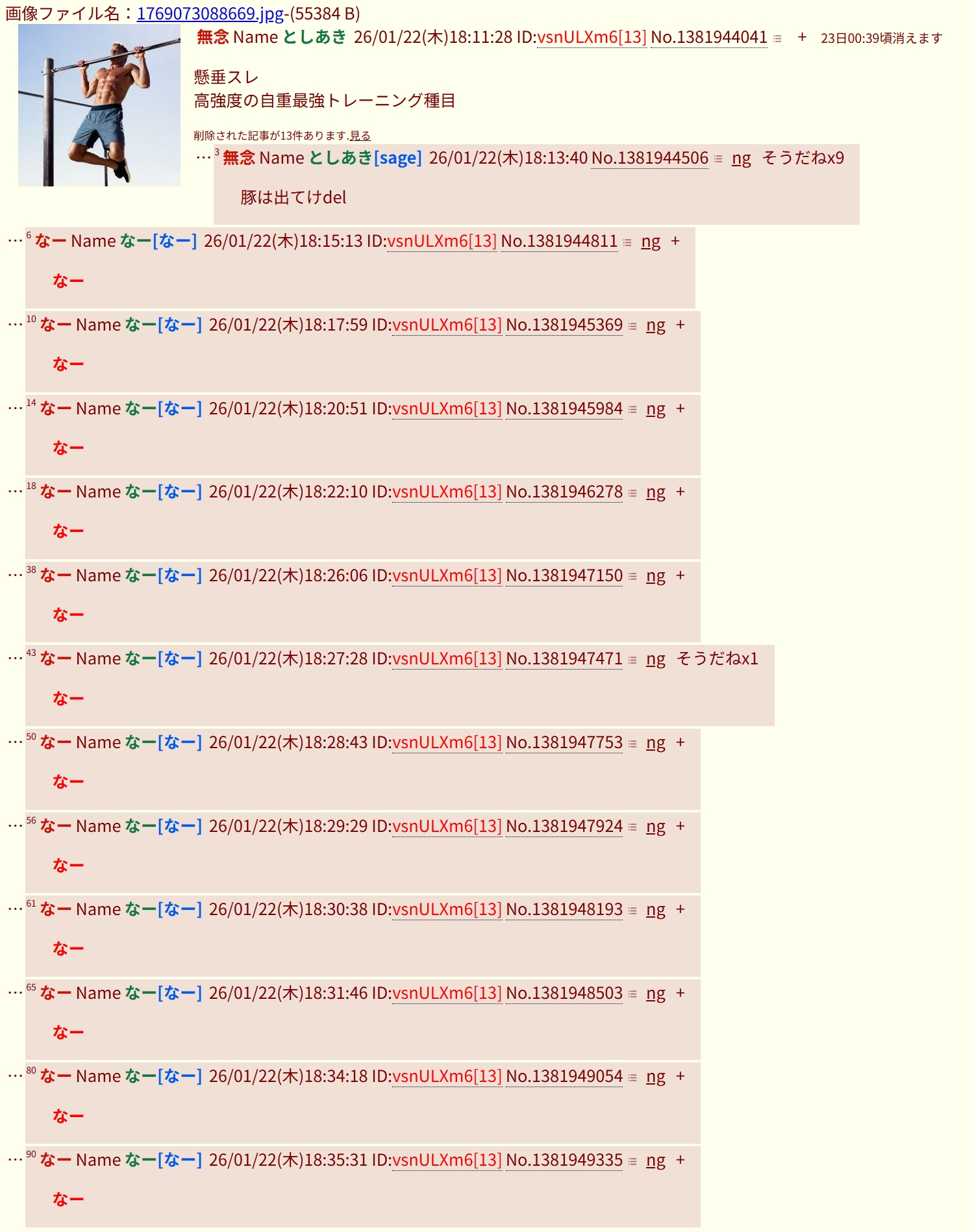| … | 16無念Nameとしあき26/01/26(月)18:15:26No.1382870673そうだねx6>懸垂やってきた(脳内で) |