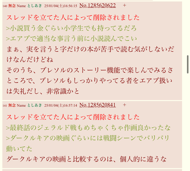 | … | 622無念Nameとしあき26/01/26(月)20:38:53No.1382904311そうだねx1>じゃあ明日del入れるついでに聞いてみるか |
