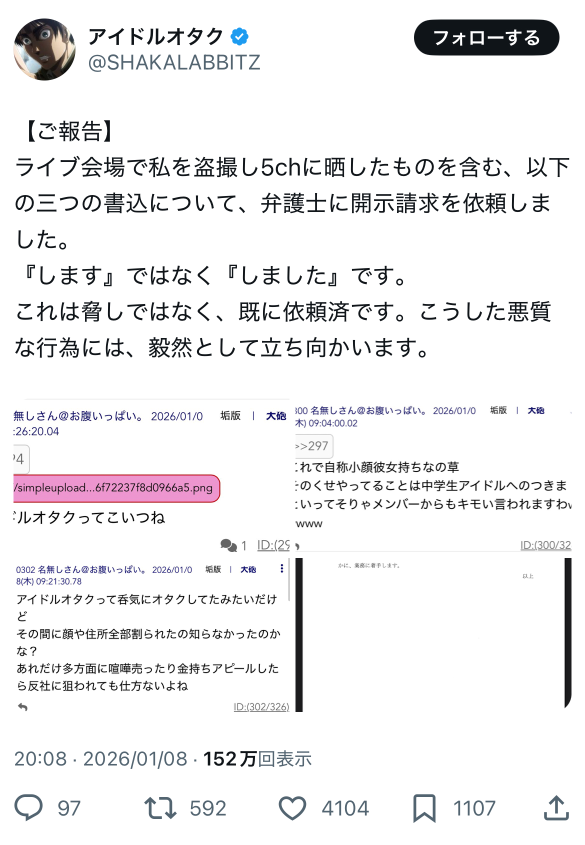| … | 17無念Nameとしあき26/01/26(月)19:20:50No.1382884874+在日知恵遅れ殺害予告性犯罪者で開示請求されている河村ヤッチャイ犯罪者のスレ |