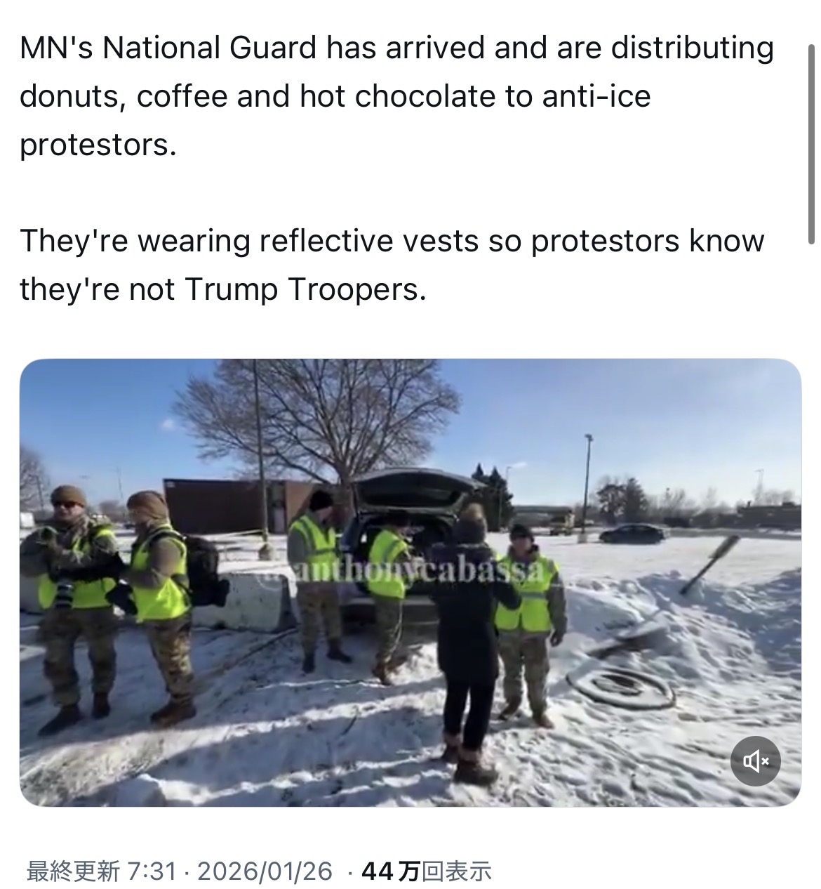 | … | 254無念Nameとしあき26/01/26(月)21:12:25No.1382913587+ 1769429545115.jpg-(238897 B) 市民の味方の州兵が反ICEの保護のために動き始めてるから超絶にややこしくなってる |