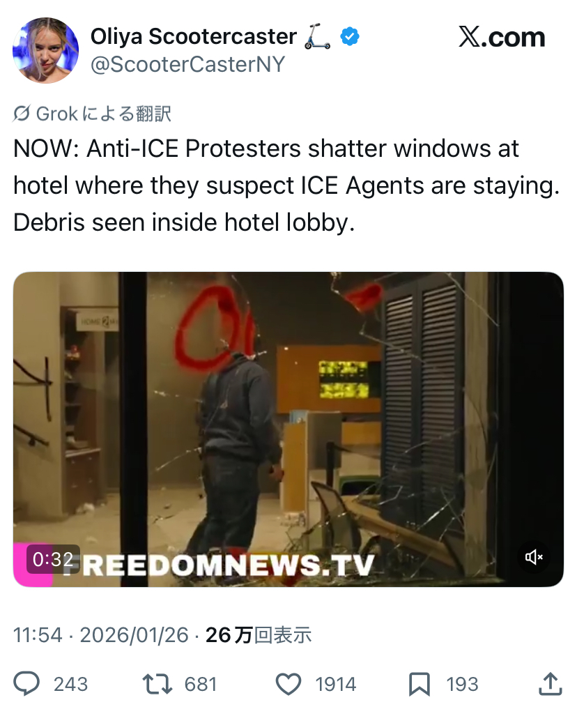 | … | 327無念Nameとしあき26/01/26(月)21:23:41No.1382916602+「今回の件はICEがやらかしました」 |
