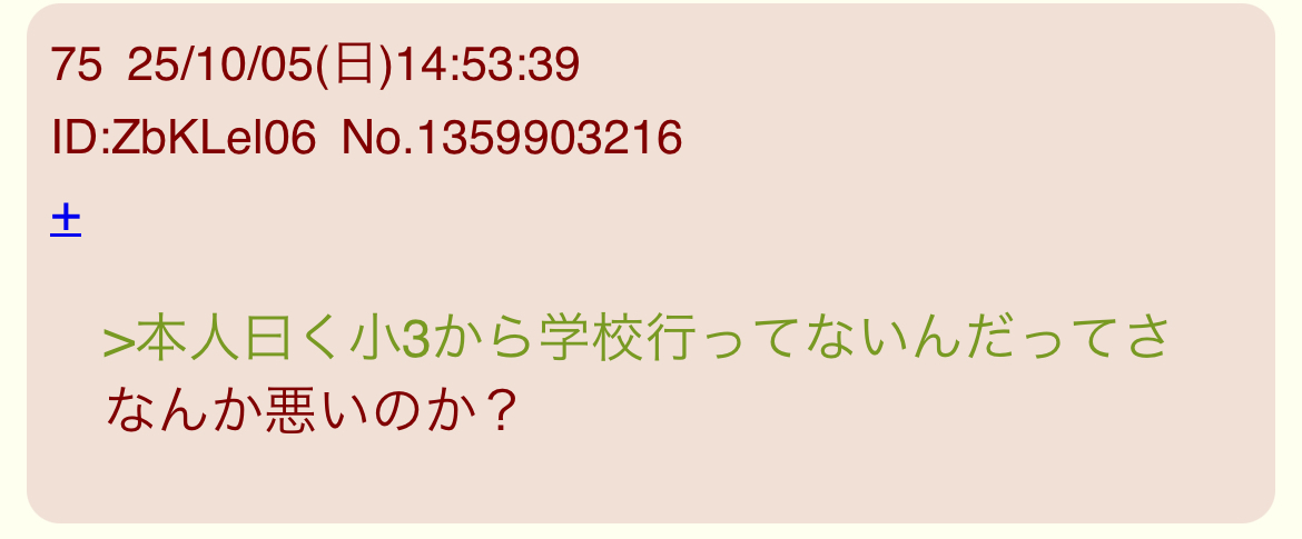 | … | 80無念Nameとしあき26/01/26(月)21:20:32No.1382915705そうだねx8お前が生きて息をしてるだけでお前の家の恥になってるの理解したら? |