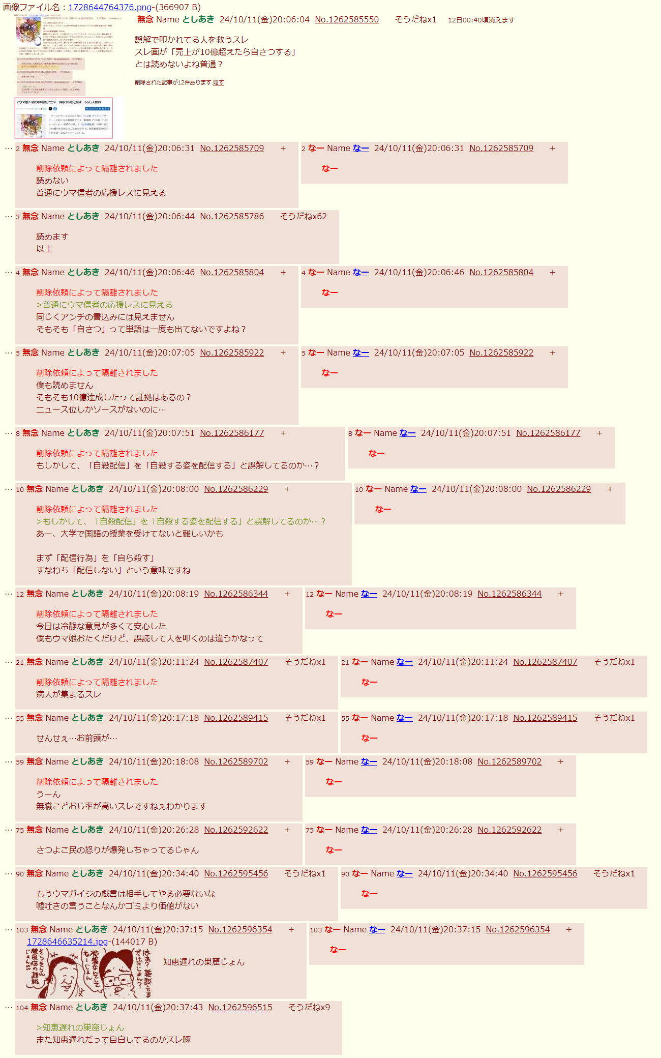 | … | 232無念Nameとしあき26/01/26(月)21:53:38No.1382924958+ウマアンチの集団スレ |