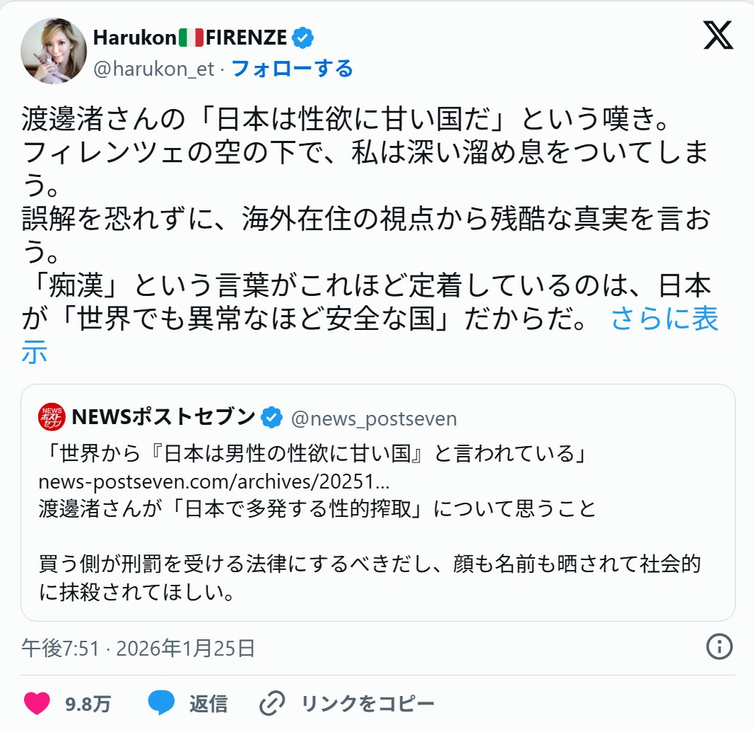 | … | 21無念Nameとしあき26/01/26(月)22:47:17No.1382939534そうだねx4>>イタリア在住女性「痴漢」という言葉がこれほど定着しているのは、日本が「世界でも異常なほど安全な国」だからだ |