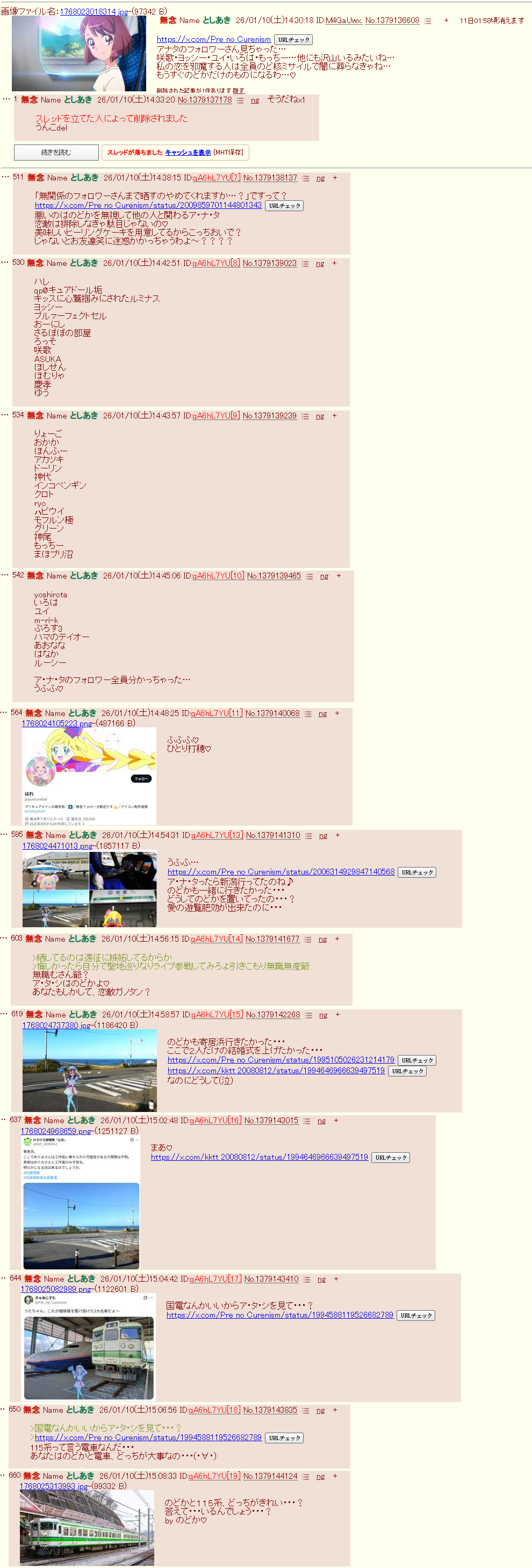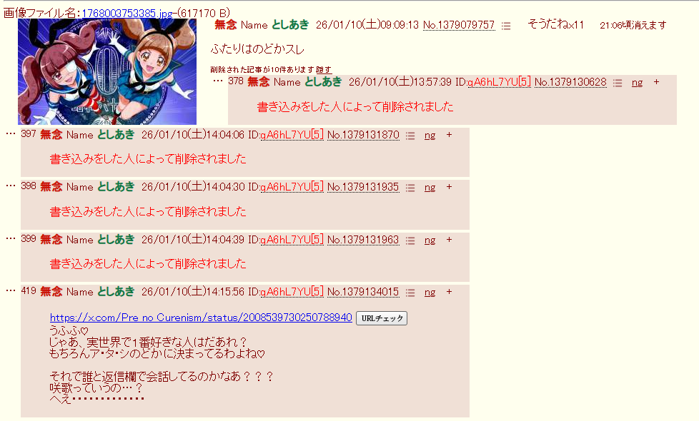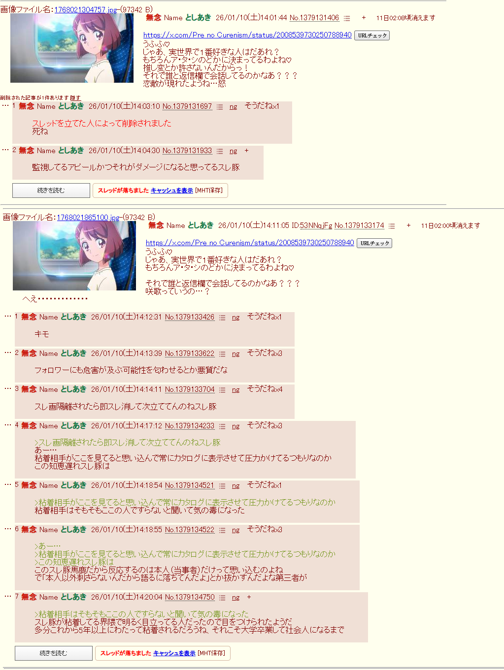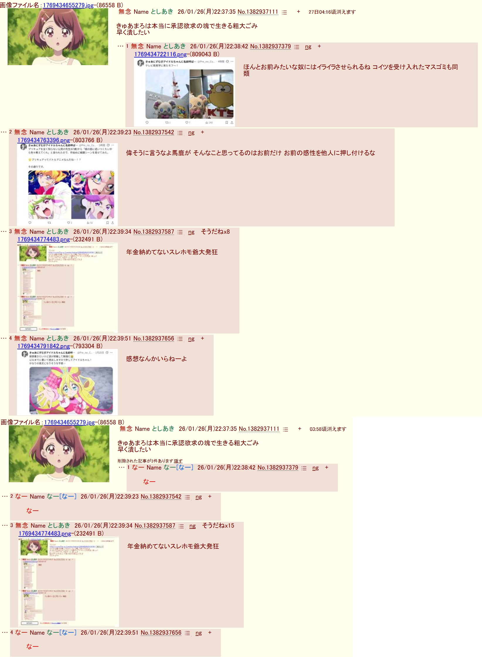 | … | 16無念Nameとしあき26/01/26(月)22:49:37No.1382940122+>オイ…お前「おはのどか」の他に「おはえりか」「おはローラ」にもdel爆撃を喰らいたいのか? |
