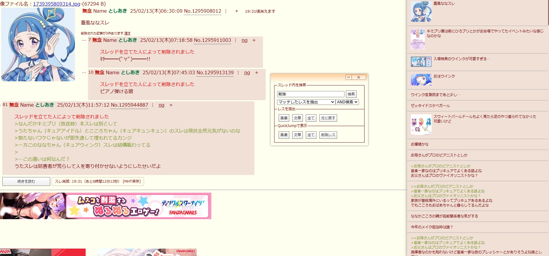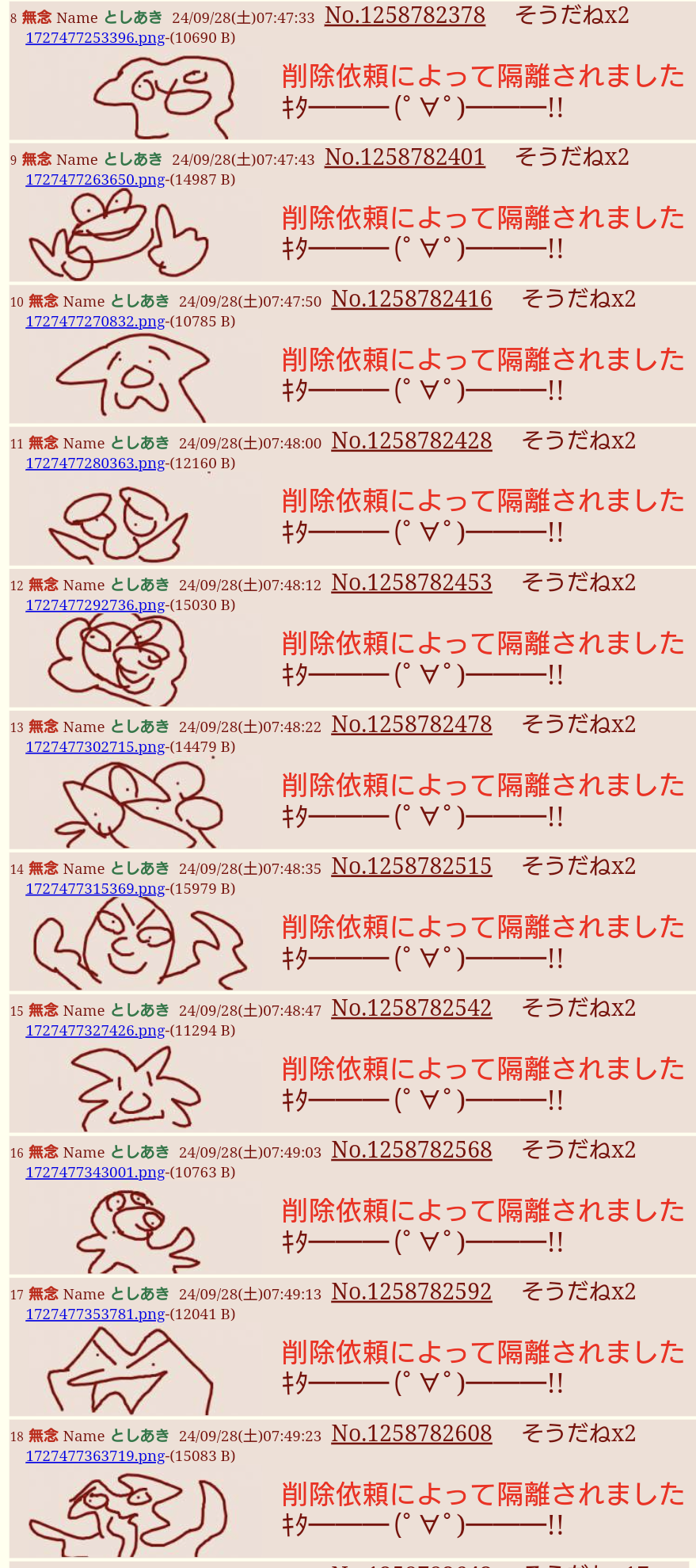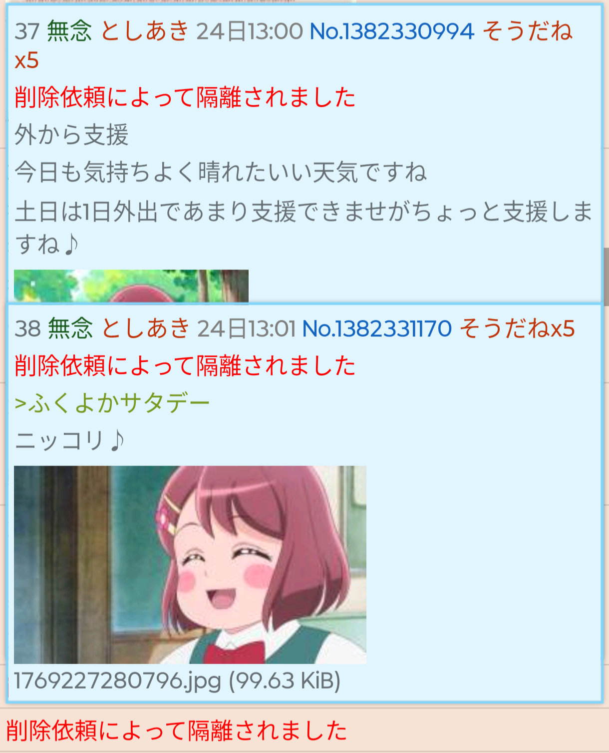 | … | 16無念Nameとしあき26/01/26(月)22:49:37No.1382940122+>オイ…お前「おはのどか」の他に「おはえりか」「おはローラ」にもdel爆撃を喰らいたいのか? |
