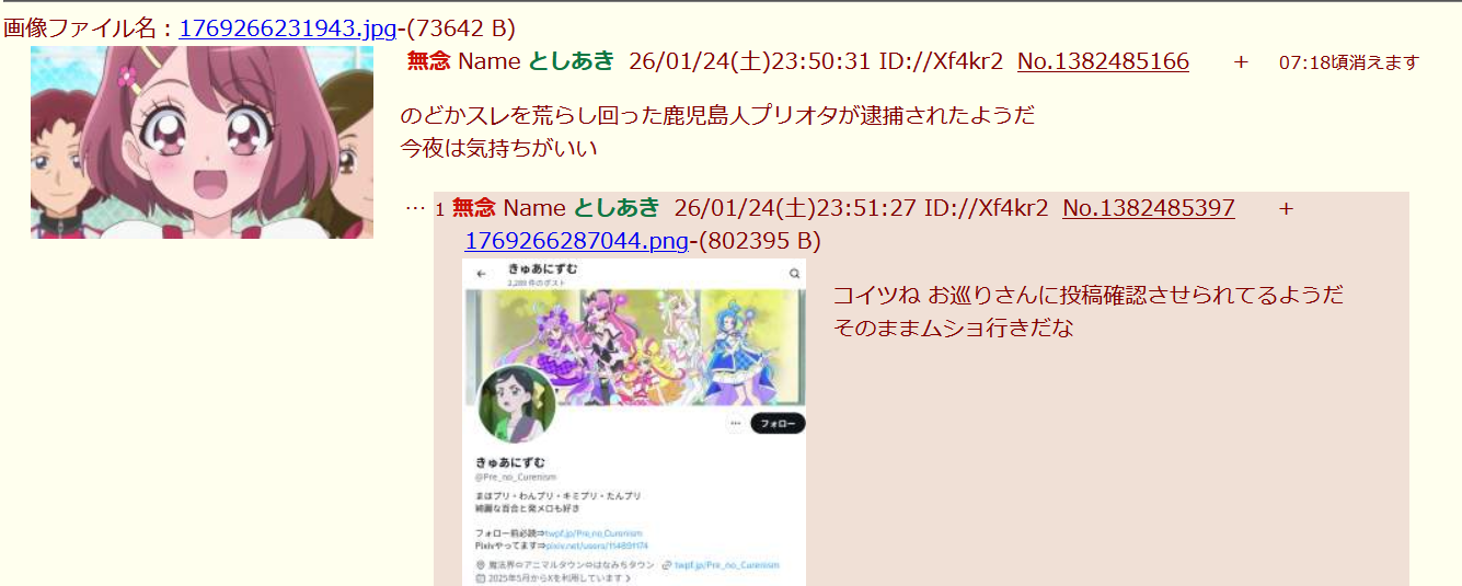 | … | 74無念Nameとしあき26/01/26(月)23:28:13No.1382949288そうだねx4>まぁこれで逮捕されなくても粘着相手が警察行ったのに |