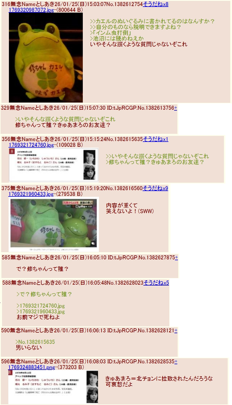 | … | 318無念Nameとしあき26/01/27(火)08:55:44No.1382991632そうだねx2チー牛河村ペ虐爺朝から冷えてるかー? |