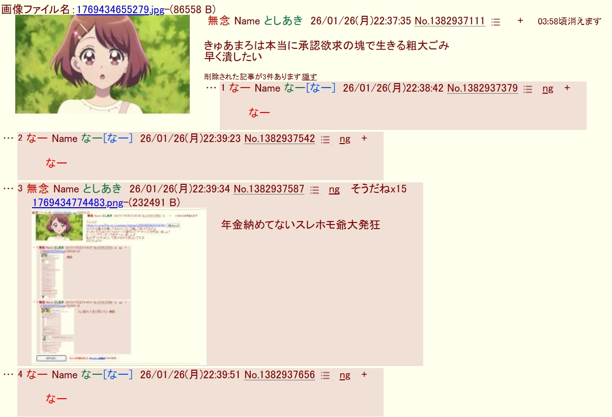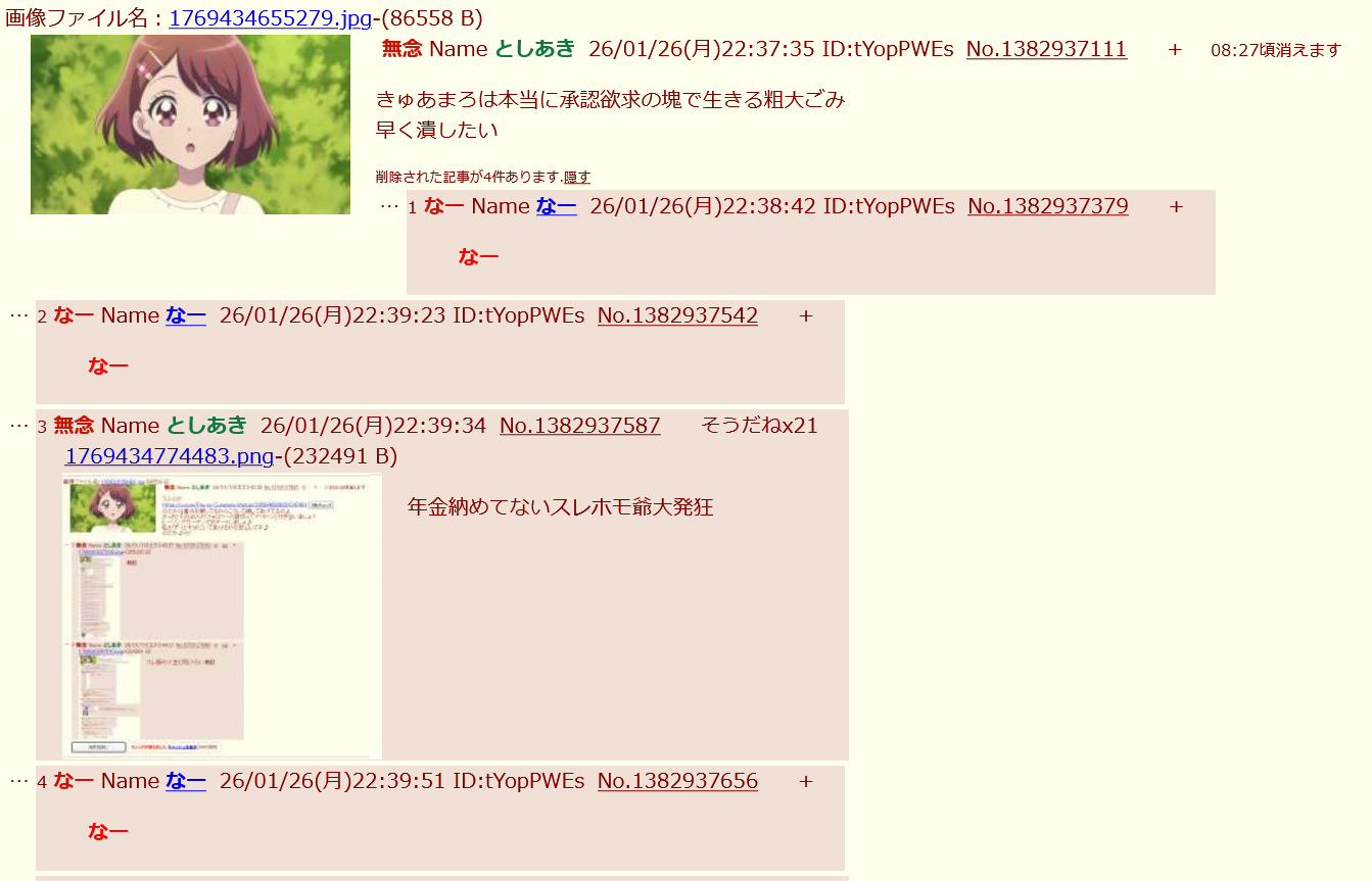 | … | 4なーNameなー26/01/26(月)22:39:51 ID:tYopPWEsNo.1382937656+なー |