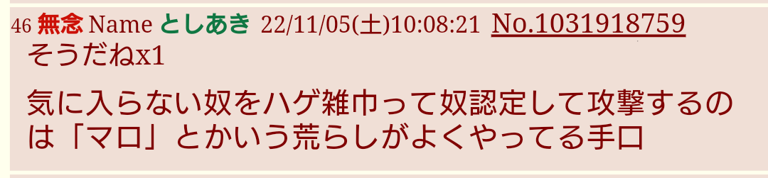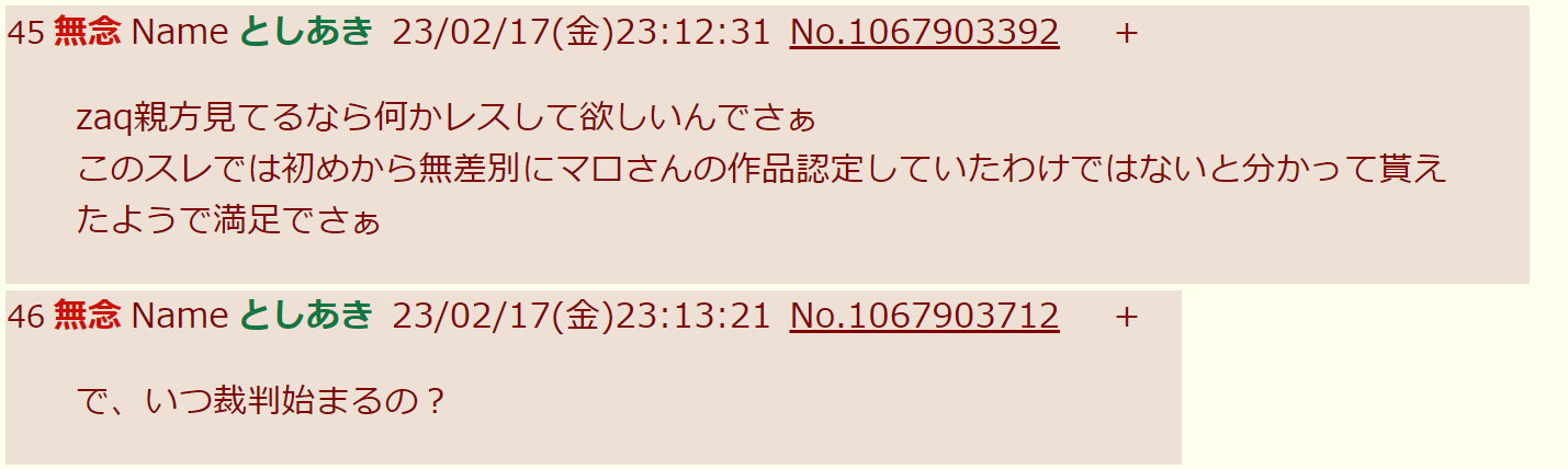 | … | 325無念Nameとしあき26/01/27(火)09:17:56No.1382993865そうだねx3>いやそれが全然絵柄の違う人にも「おめぇマロさんじゃな?」と執拗に攻撃してて |