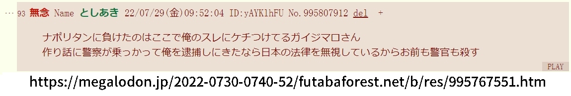 | … | 78無念Nameとしあき26/01/26(月)23:31:13No.1382949979そうだねx2>>まぁこれで逮捕されなくても粘着相手が警察行ったのに |