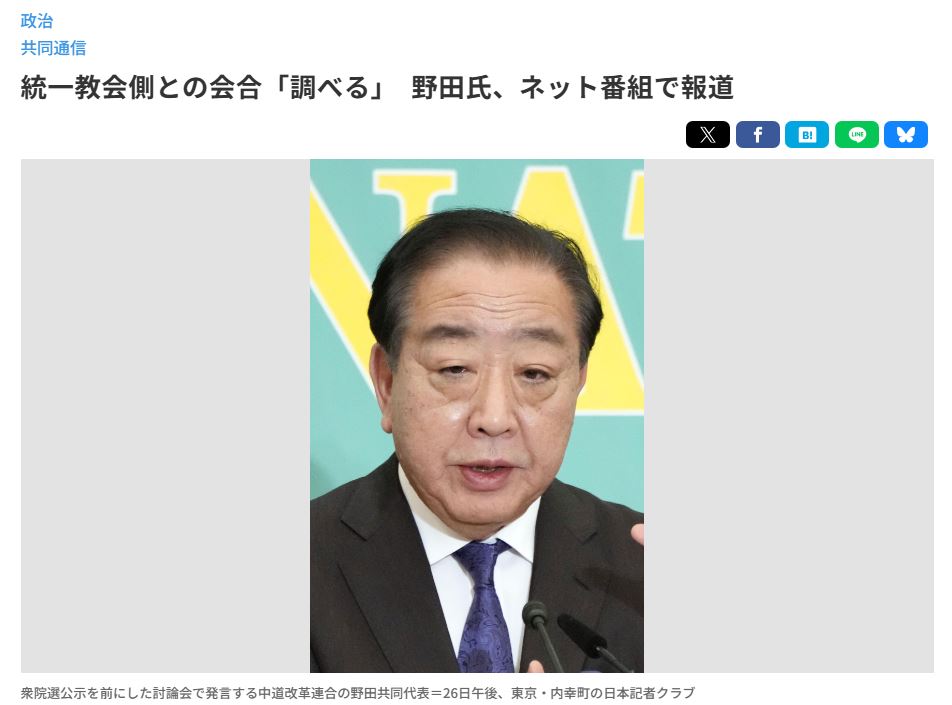 | … | 170無念Nameとしあき26/01/27(火)05:43:53No.1382978381+高市総理と統一教会の話はデマだオールドメディアがーと散々だったのに野田の話はすぐに信じるんだな |