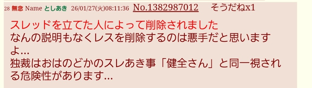 | … | 26無念Nameとしあき26/01/27(火)08:17:53No.1382987671そうだねx5>>昨日のは健全語丸出しだったから潰して正解だったけどそのスレはちょっと様子見みた方がいいですね |
