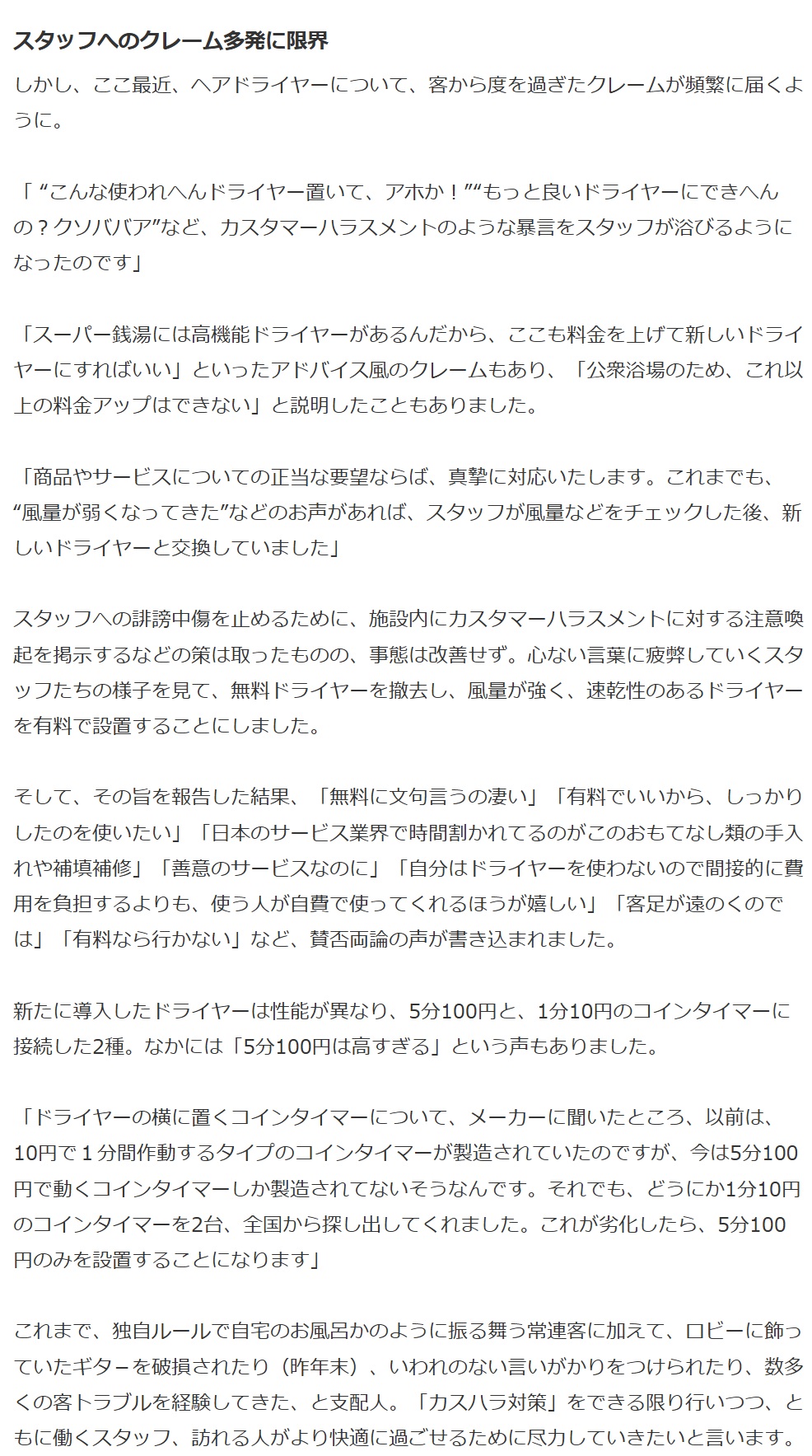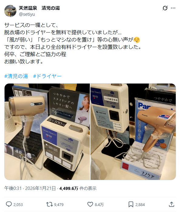 | … | 84無念Nameとしあき26/01/27(火)09:47:37No.1382997168そうだねx1前提としてドライヤーが無料って認識できなくね?言い分としては入浴料に含まれないって言えるんだろうけど客視点だと入店できた時点で置いてあるものは料金に含まれるって思っちゃうし |