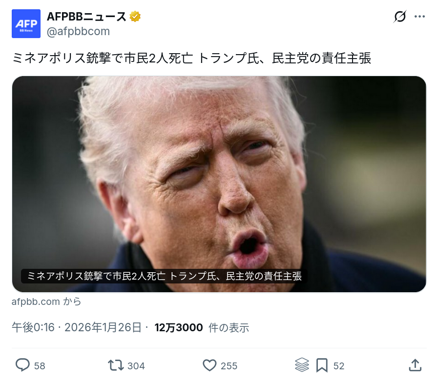 | … | 39無念Nameとしあき26/01/27(火)09:07:59No.1382992864+こんなん日本でいう押した押されたで暴行だ!暴行だ!が銃に変わっただけでしょ |