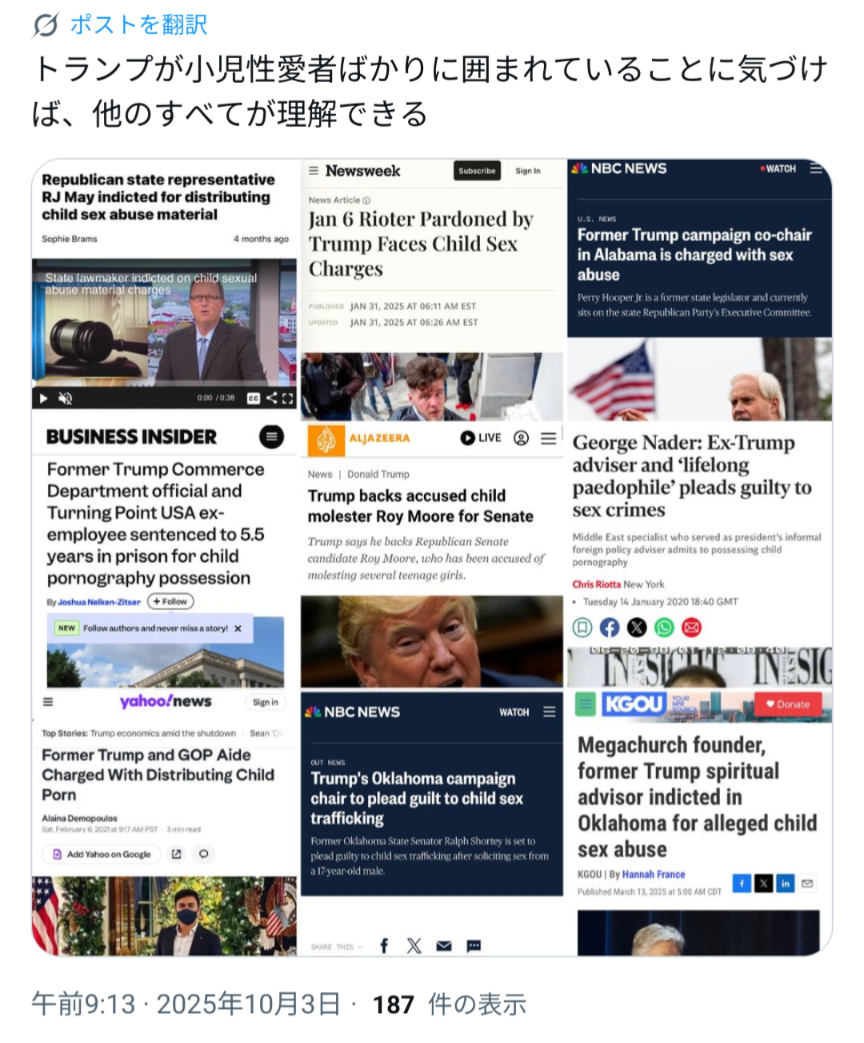 | … | 355無念Nameとしあき26/01/27(火)10:38:35No.1383003329+>>>トランプを否定することは中国の日本侵略を肯定することになるらしい |