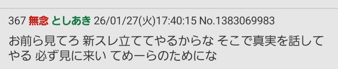 | … | 472無念Nameとしあき26/01/27(火)21:25:00No.1383130076そうだねx6>え またあの老人自分のスレなのに書き込めなくなってんの? |