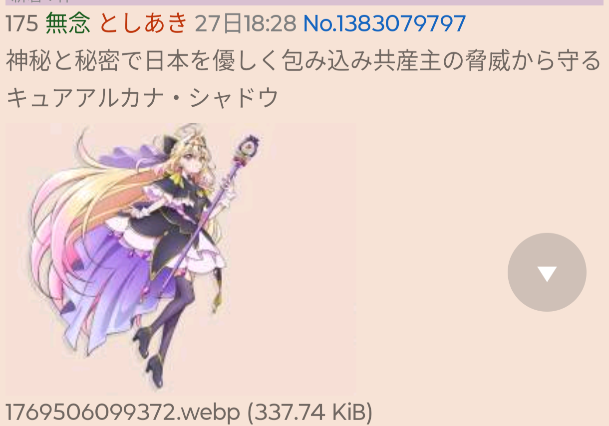 | … | 494無念Nameとしあき26/01/27(火)21:29:29No.1383131464そうだねx5>きゅあまろ兄貴は一回爺がXの画像パクってmayに貼った時に来ましたね… |
