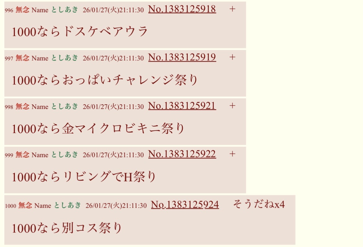 | … | 987無念Nameとしあき26/01/27(火)23:29:17No.1383163861そうだねx11000ならパンイチオナニー祭り |