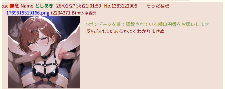 | … | 918無念Nameとしあき26/01/27(火)23:23:47No.1383162513+大人なのはをボンテージ姿にしてください |