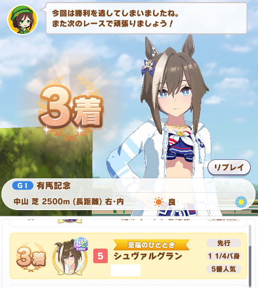 | … | 15無念Nameとしあき26/01/27(火)23:10:09 ID:eGudOoegNo.1383159060そうだねx3 1769523009427.png-(291312 B) 追い比べできなかったのが原因で最後までいい感じだったのに一気に追い上げてきたオグリとグラスにやられましたわ・・・ |