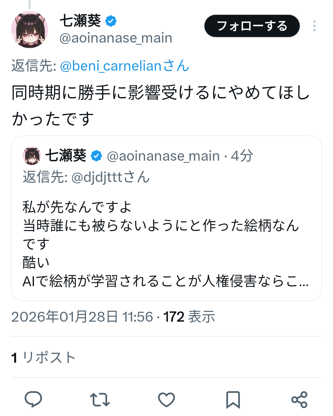| … | 99無念Nameとしあき26/01/28(水)12:16:09No.1383232246+そもそも私のえがばくったくせにとか言ってたのに同時期に影響うけてほしくなかったとかなんだよその返事は |