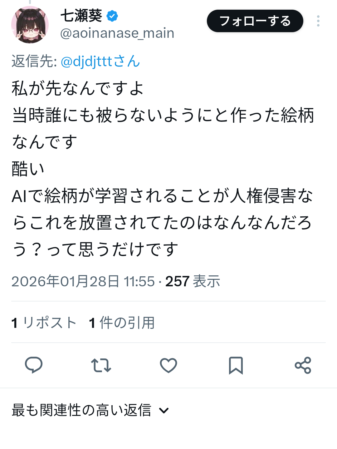 | … | 54無念Nameとしあき26/01/28(水)12:03:59No.1383230174+(作家とした活動している)同時期に勝手に(私の絵柄の)影響を受けるのをやめてほしかったです |