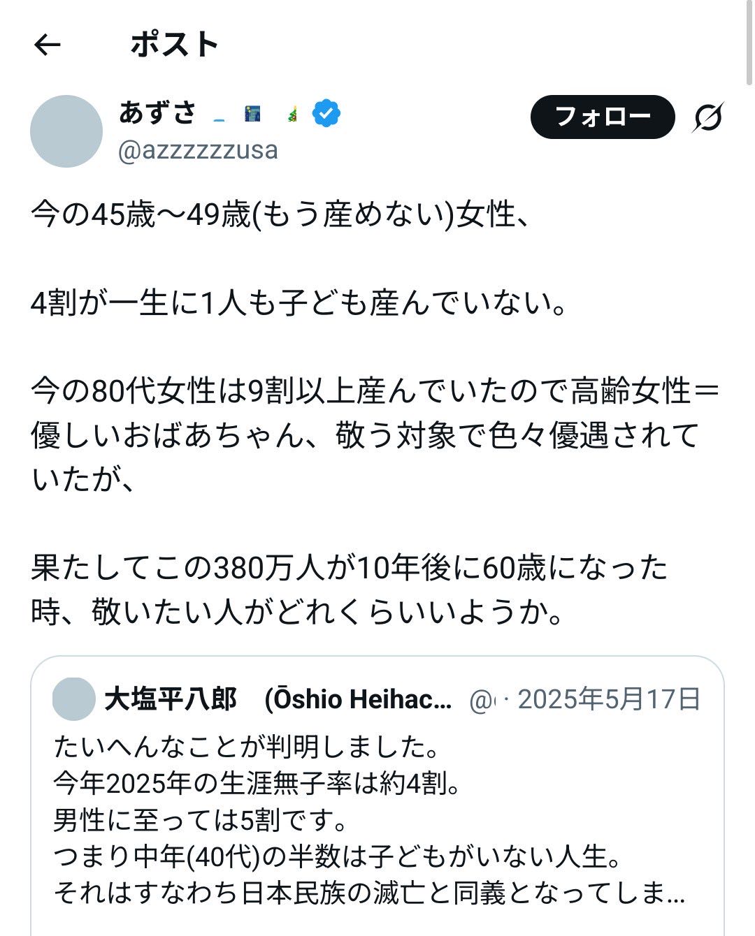 | … | 7無念Nameとしあき26/01/28(水)11:13:59No.1383223528そうだねx3>4割も産んでないのかアラフィフ |