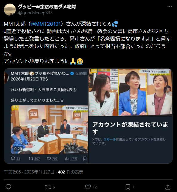 | … | 71無念Nameとしあき26/01/28(水)14:54:26No.1383259434+ 1769579666212.png-(402071 B) 党首討論の動画を流すとなぜかXアカウント停止 |