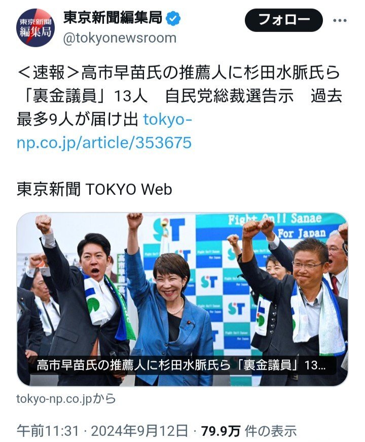 | … | 58無念Nameとしあき26/01/28(水)14:45:05No.1383258168+>【独占スクープ】高市早苗事務所 統一教会&逮捕社長のパー券購入を隠蔽していた!《裏帳簿を入手》《「買うたれ」54万円分購入も不記載 逮捕社長が告白》《パー券購入を「寄附」と虚偽記載 税控除で「選挙区民を優遇」》 |
