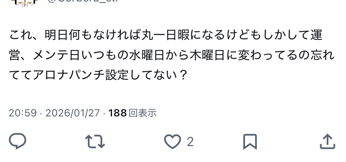 | … | 60無念Nameとしあき26/01/28(水)14:33:39No.1383256587そうだねx2メンテ日間違えた説とか出てるけど仮にそうだとしてもレイド中にメンテなんか挟むんじゃねえよ |