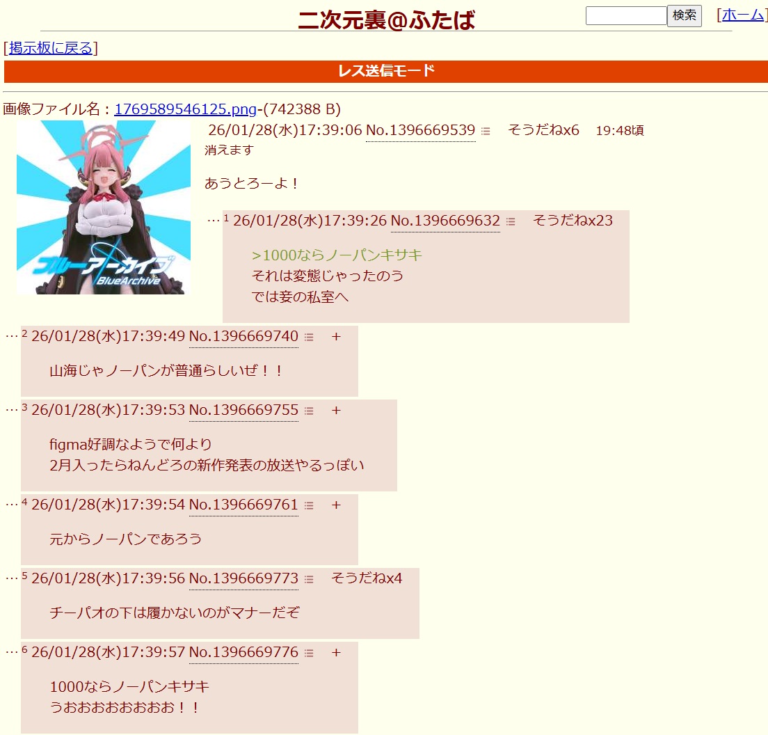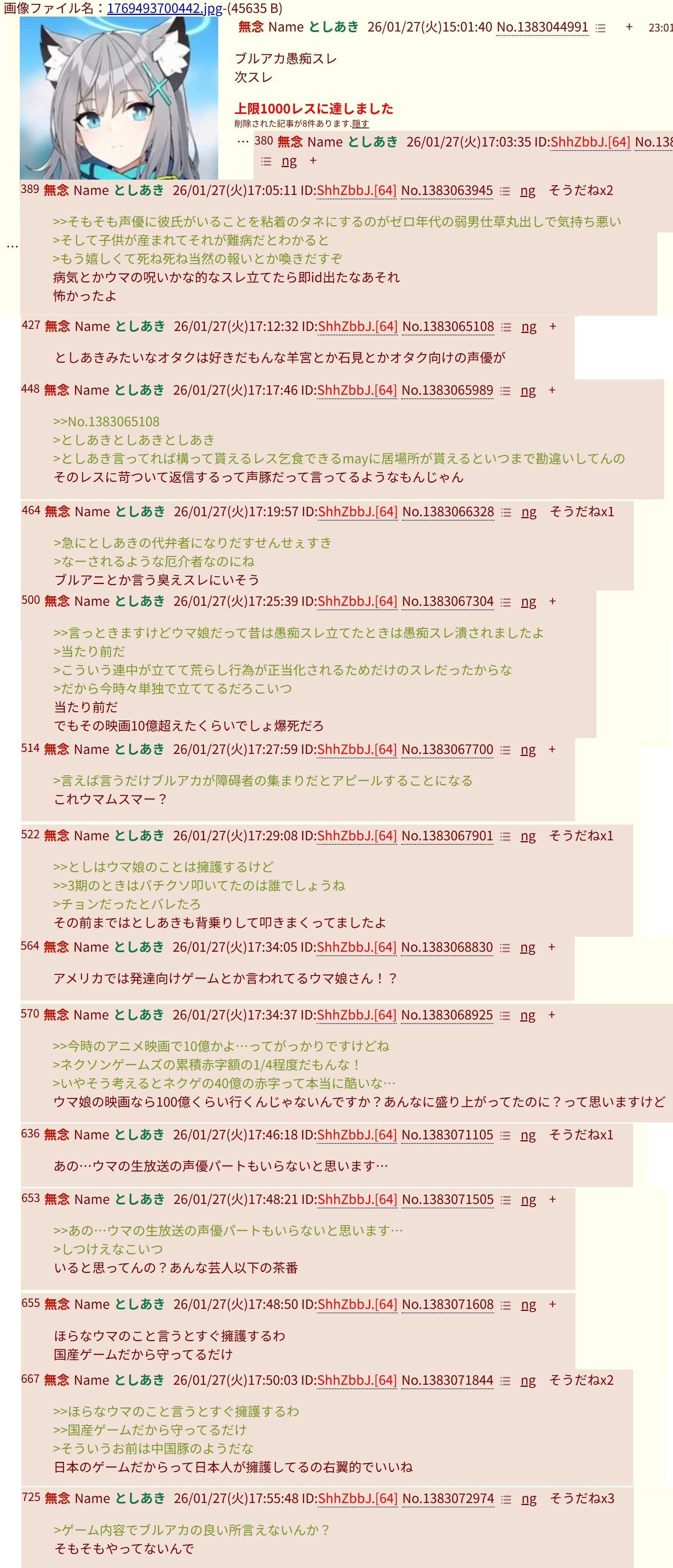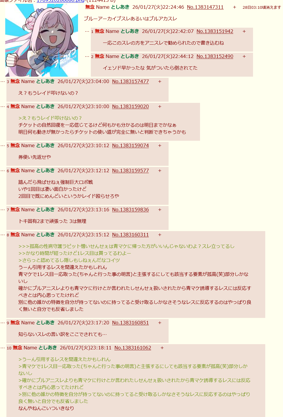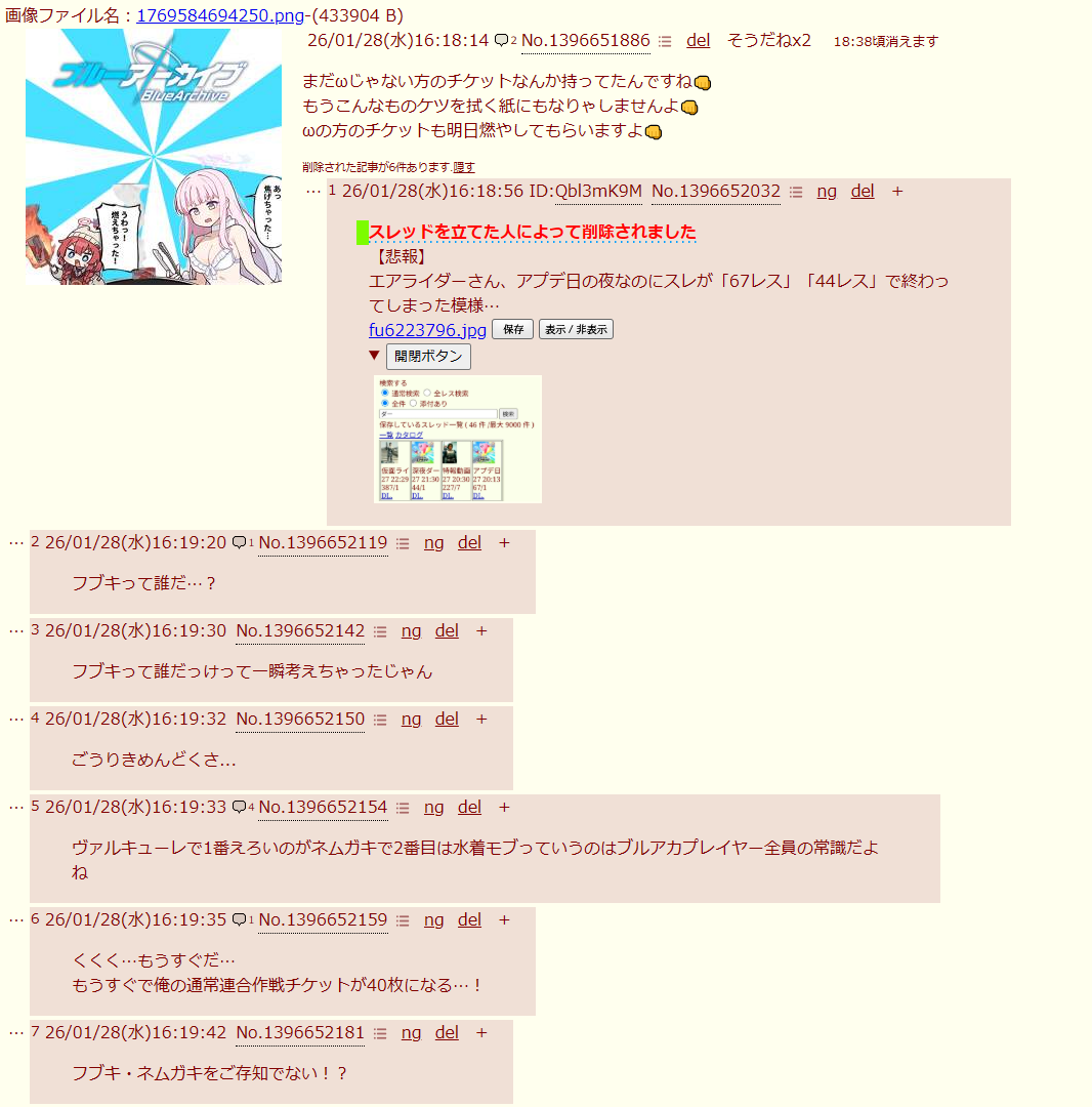| … | 841無念Nameとしあき26/01/28(水)18:53:37No.1383300880そうだねx2>>ブルアカの場合ってIDにすると露骨に伸びなくなる |