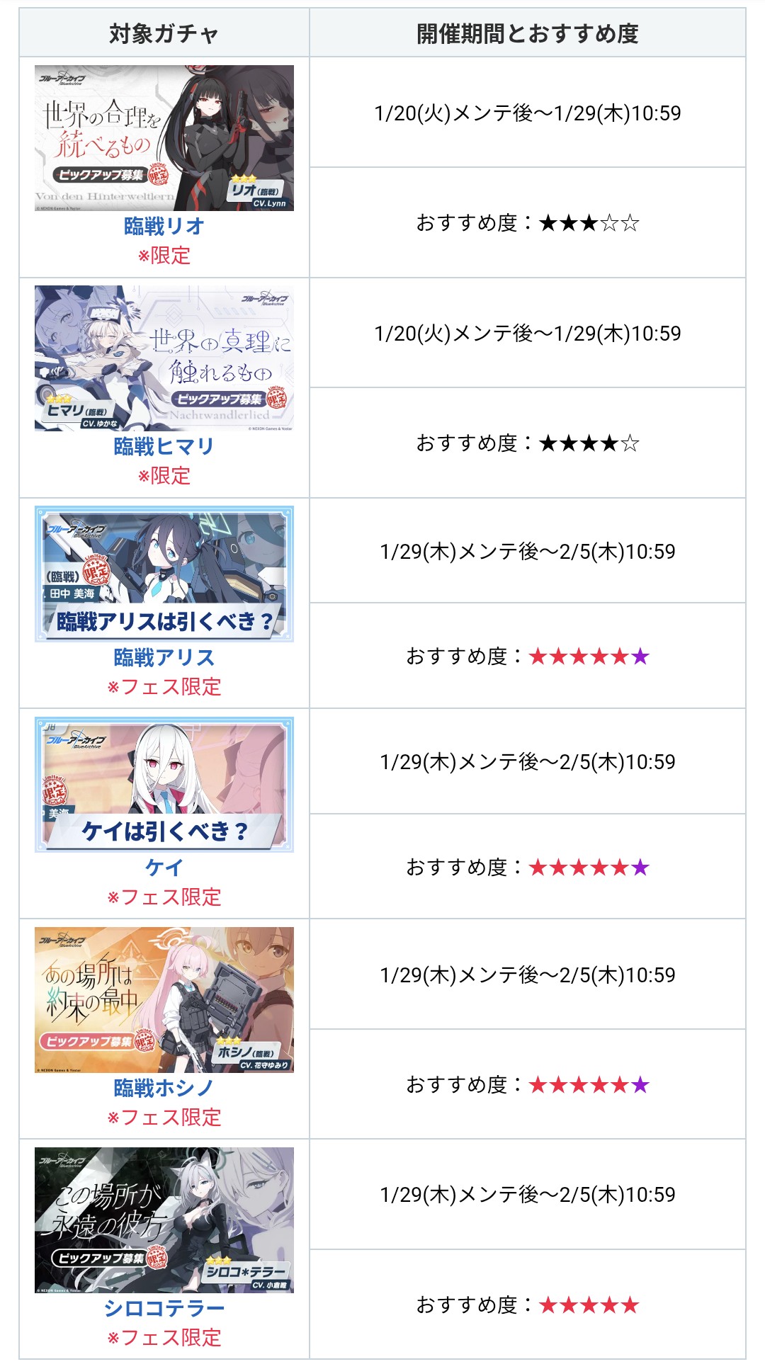 | … | 44無念Nameとしあき26/01/28(水)14:26:34No.1383255459+ヒマリ確保しないなら今後の総力系コンテンツ出禁の可能性が高いが欲しいのはリオなんだよなあ |