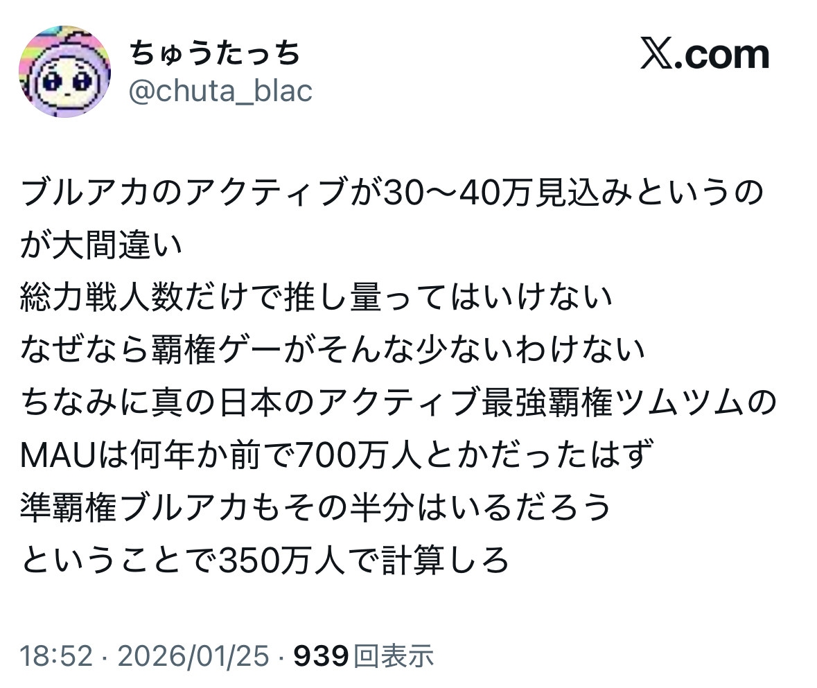 | … | 925無念Nameとしあき26/01/28(水)19:54:33No.1383316322+ブルアカ抜きでも数年前ほどの勢いはないのにブルアカに足引っ張られたら困るだろ |