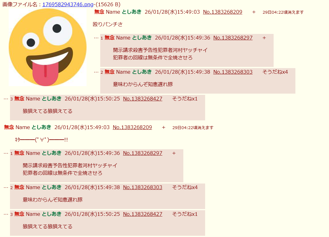 | … | 1無念Nameとしあき26/01/28(水)15:49:36No.1383268297+開示請求殺害予告性犯罪者河村ヤッチャイ |