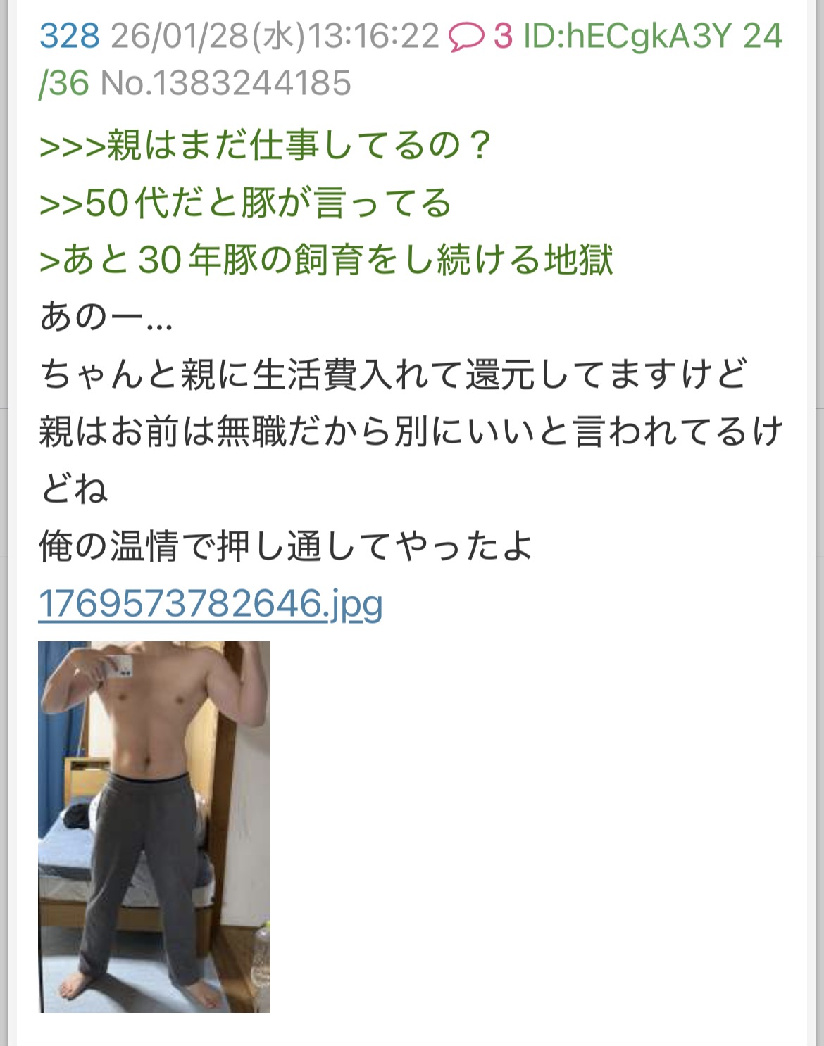 | … | 184無念Nameとしあき26/01/28(水)17:09:46No.1383281377+>>子供部屋に引きこもって親に養われてる29歳のゴミが金持ってる自慢しても誰にも刺さんないよ |