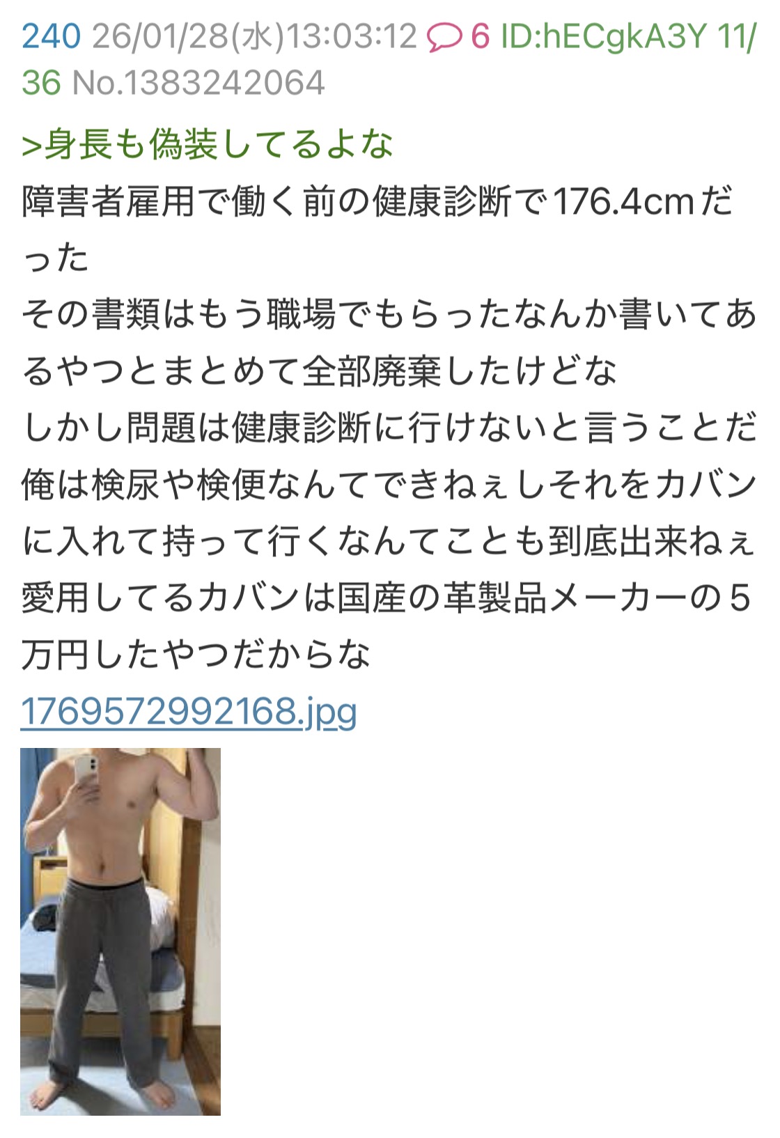 | … | 49無念Nameとしあき26/01/28(水)16:25:53No.1383274318+検便も検尿も出来ないヤツに言われたかねえよ |