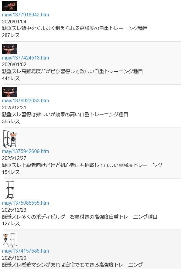 | … | 210無念Nameとしあき26/01/28(水)17:38:29No.1383285879+>懸垂スレは不定期だから今日立つかどうかはわからない |