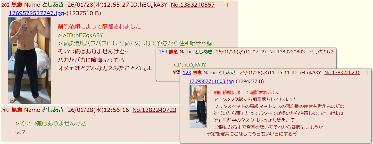 | … | 162無念Nameとしあき26/01/28(水)16:54:53No.1383279054+>被害妄想が出てて組織だった行動によるDelだと思い込んでる |