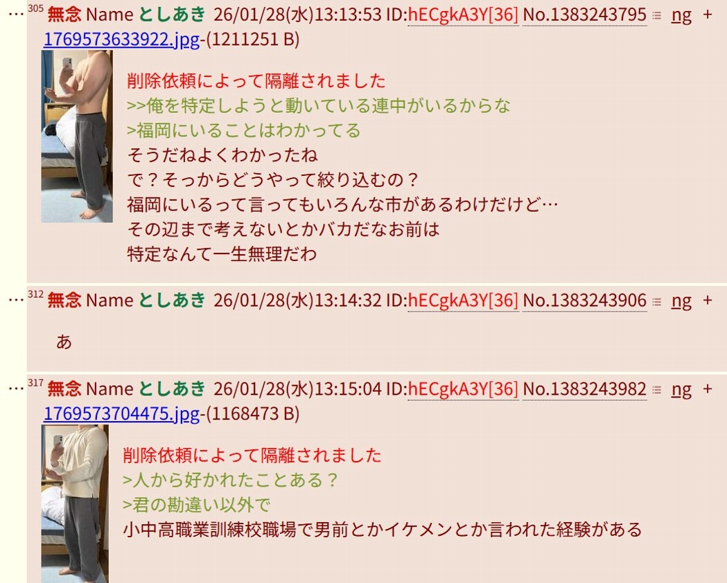 | … | 195無念Nameとしあき26/01/28(水)17:21:09No.1383283083+>市町村まで特定は出来ねぇだろって言ってたけど福岡在住は否定しなかったな |