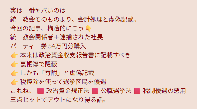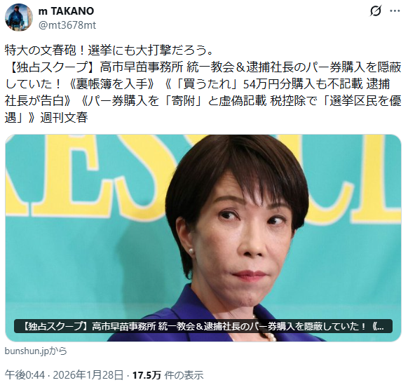 | … | 10無念Nameとしあき26/01/28(水)19:27:31No.1383308986そうだねx41 1769596051616.jpg-(50314 B) >「野田佳彦は統一と関わりあり。高市さんはクリーン」 |