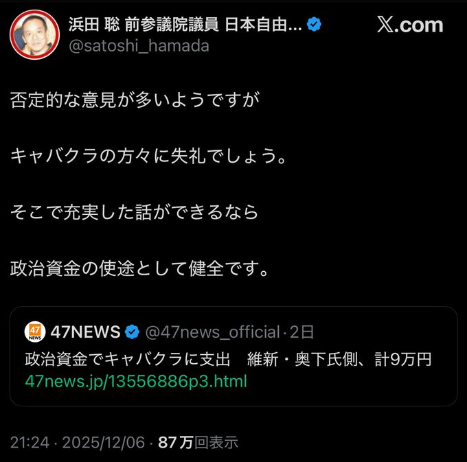 | … | 9無念Nameとしあき26/01/29(木)03:40:18No.1383409269+ 1769625618970.jpg-(82390 B) 東谷義和という一度も国会に出席せずに満額の議員報酬とボーナスを受け取るアホがいて、かつ、テメエのところの政治資金収支報告書は、税金でキャバクラとゴルフだろ! |