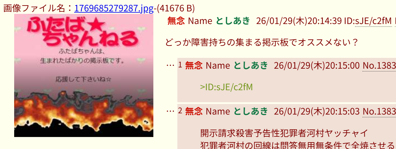 | … | 30無念Nameとしあき26/01/29(木)20:13:36No.1383543044そうだねx2開示請求殺害予告性犯罪者河村ヤッチャイ |