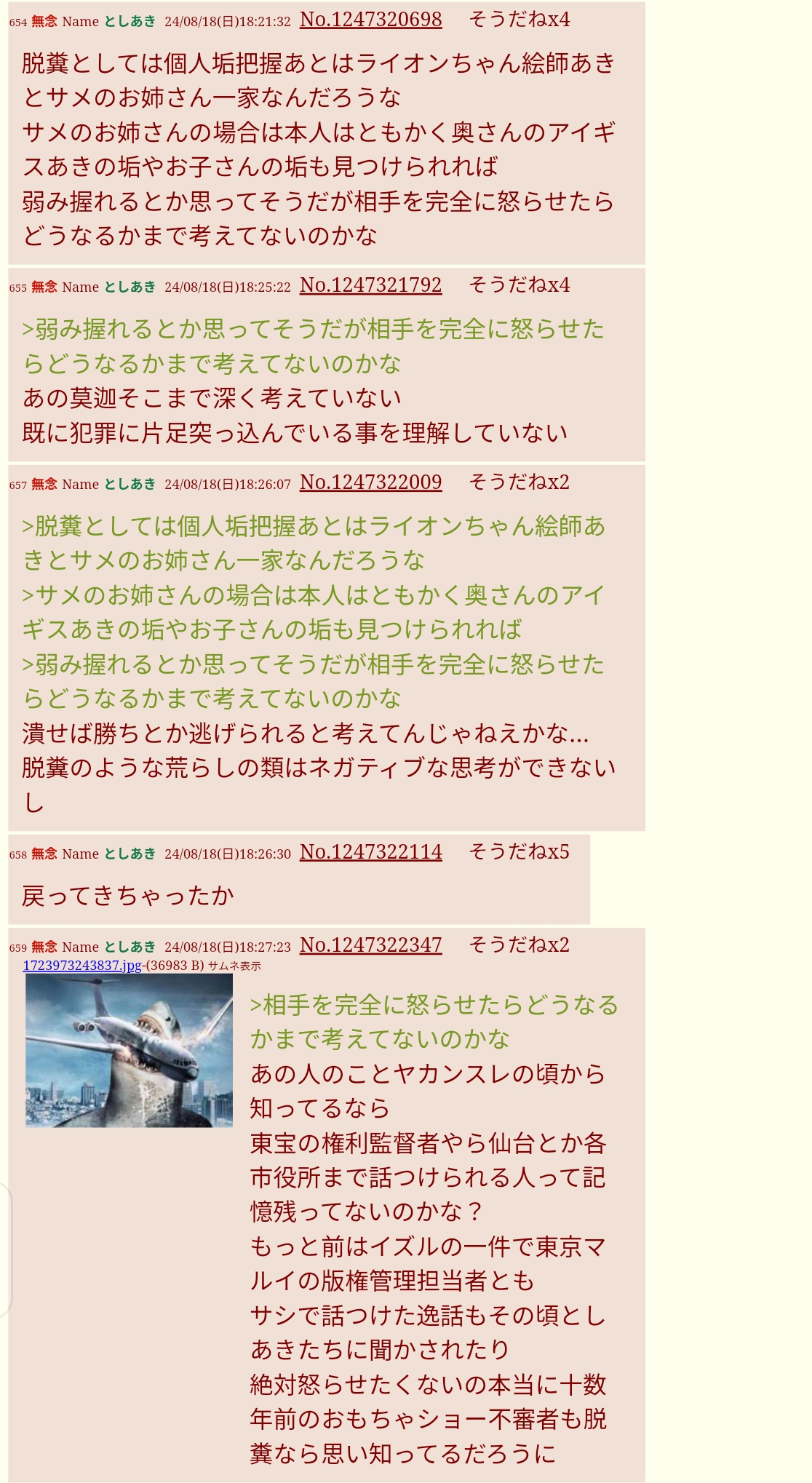 | … | 68無念Nameとしあき26/01/29(木)21:32:46No.1383566489そうだねx7>サメのお姉さんの腰巾着どものせいでやっぱりあいつおかしいんだなって話にしかならなくて草 |