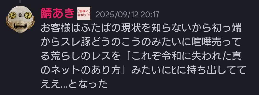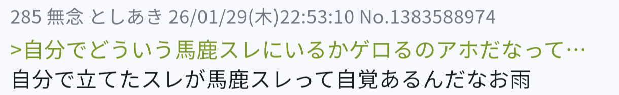 | … | 425無念Nameとしあき26/01/30(金)00:53:48No.1383613943+荒らしの中では自分を叩いてたとしあきたちを同一個体ってなってて |